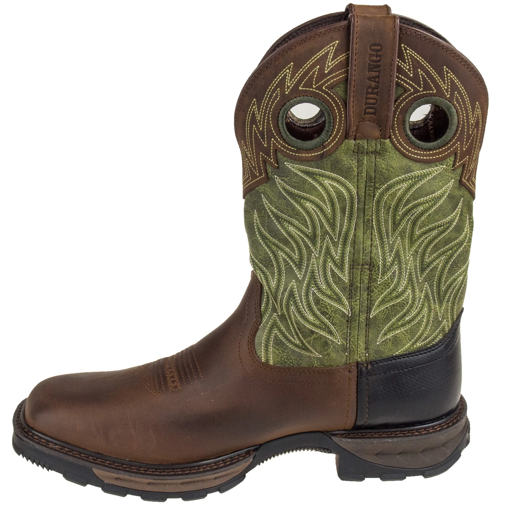 This brown and green waterproof Durango boots are built to provide strong stability with their dual-density midsole and shock absorbing 1.5-inch Rocker heel. An included outsole design was created to be oil- and slip-resistant, giving you impressive traction on a wide variety of surfaces and terrain.
