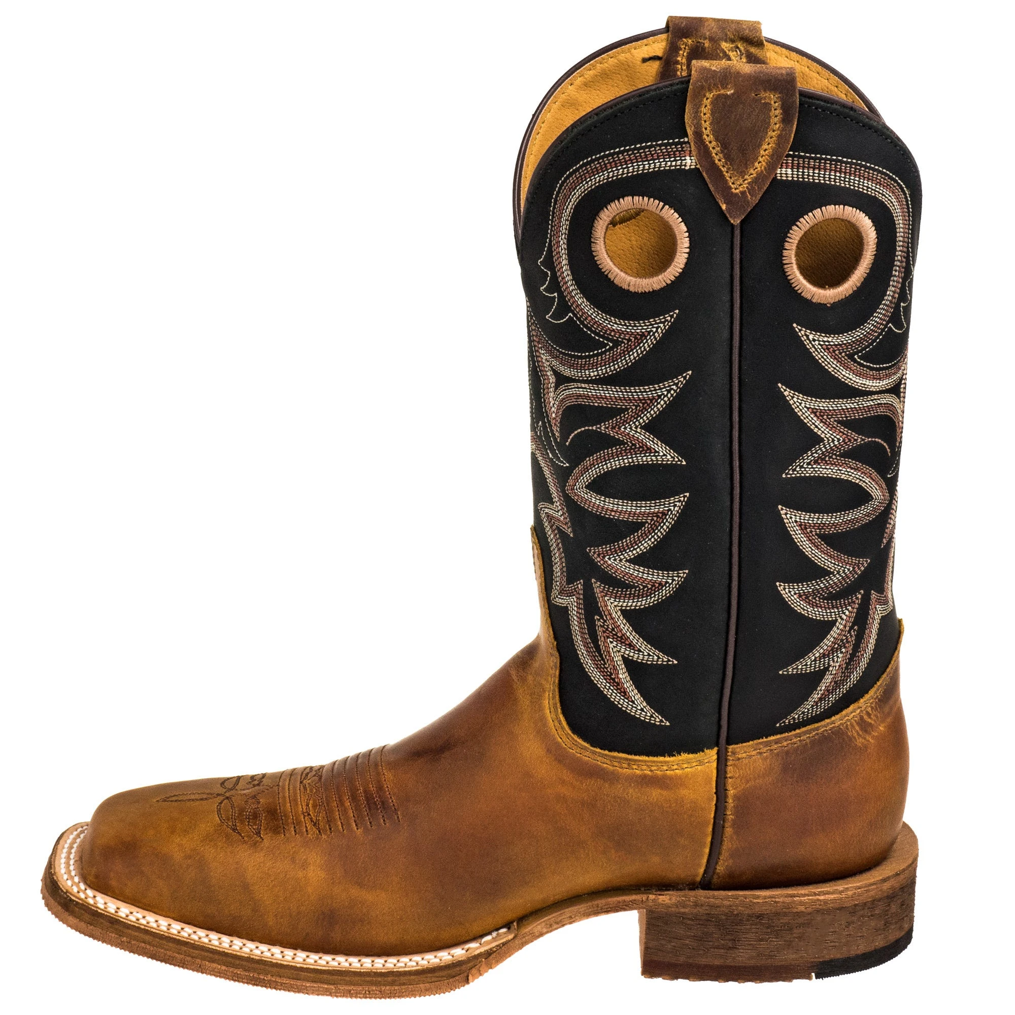 The Caddo brown Bent Rail boots are 11 inches in height with black leather on the shaft and tan on the feet. This tan stonewashed tobacco cowhide at the bottom is tough and durable, the density of the leather leaves it resisting abrasions and wear and tear better than other cuts of leather, while still remaining supple enough to flex with your movements so you can enjoy flexible, comfortable men’s boots. The 11-inch black spiral cowhide shaft is built with just the right amount of stiffness you need for a great fitting pair of cowboy boots. The light golden brown stitch pattern on the shaft is classy and stylish as well. The deep cut-away top and leather finger pulls make getting these western style pull on boots on and off a lot easier. The wide square toe design offers plenty of room for your toes, even if you have wide feet and the stylish design will not disrupt the rugged look.