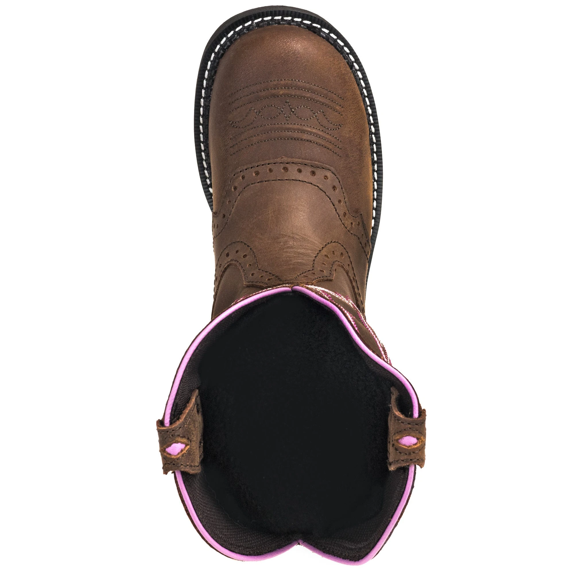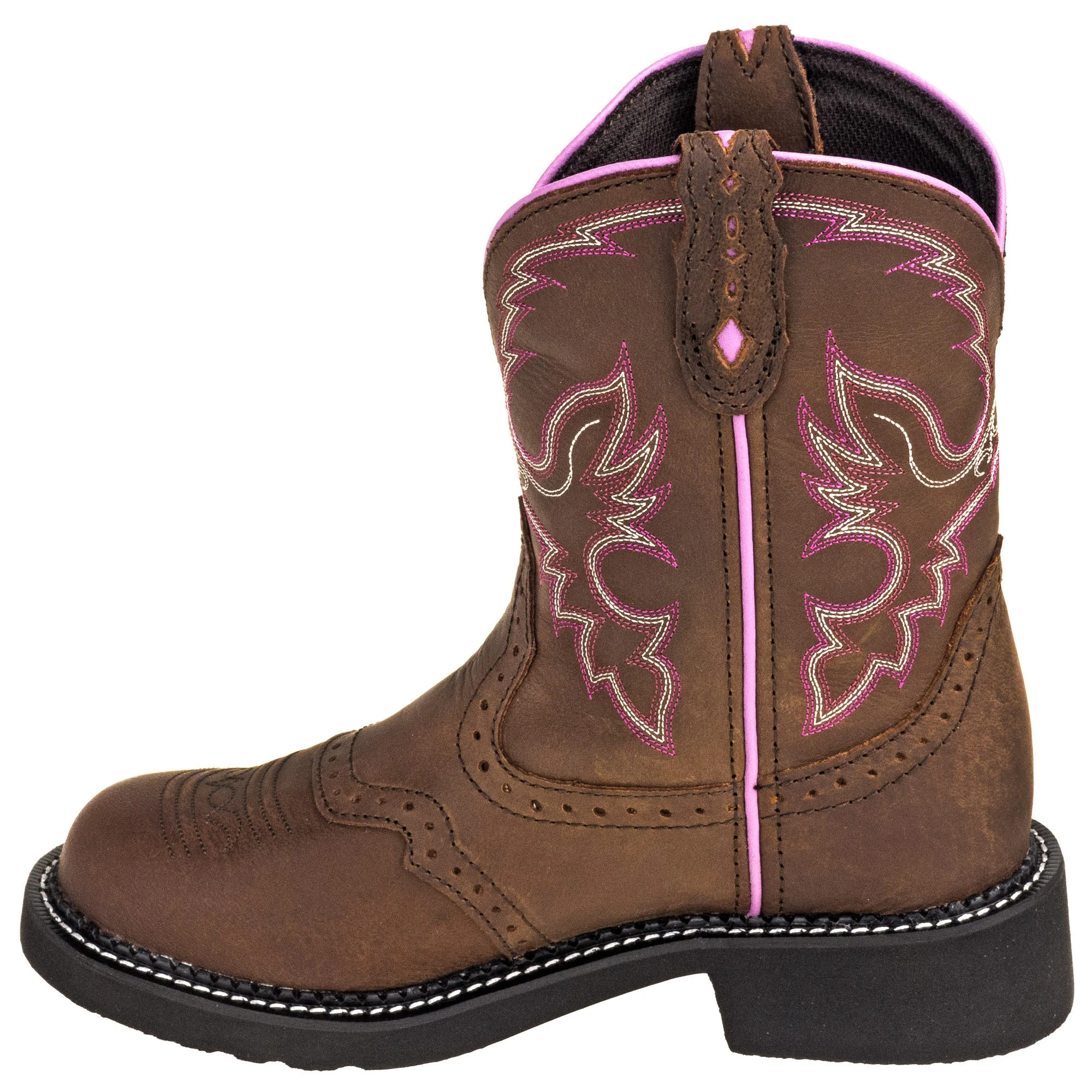 Eight inches of Aged Bark chocolate brown leather on the uppers gets the job done. This strong but supple leather is first of all tough enough to work hard right along with you. Then you add the bit of vintage style and hot pink and cream stitching for a fun look. The pastel pink seam on the quarter and trim is feminine and fun, while the cut diamond pull strap adds some more unique detail to these women’s Gemma boots. The J29 Gypsy Fashion round toe offers a little more space than the pointier alternatives and looks great with any outfit. In or out of the saddle, you’re ready to go to work with these feminine 8-inch brown leather boots.