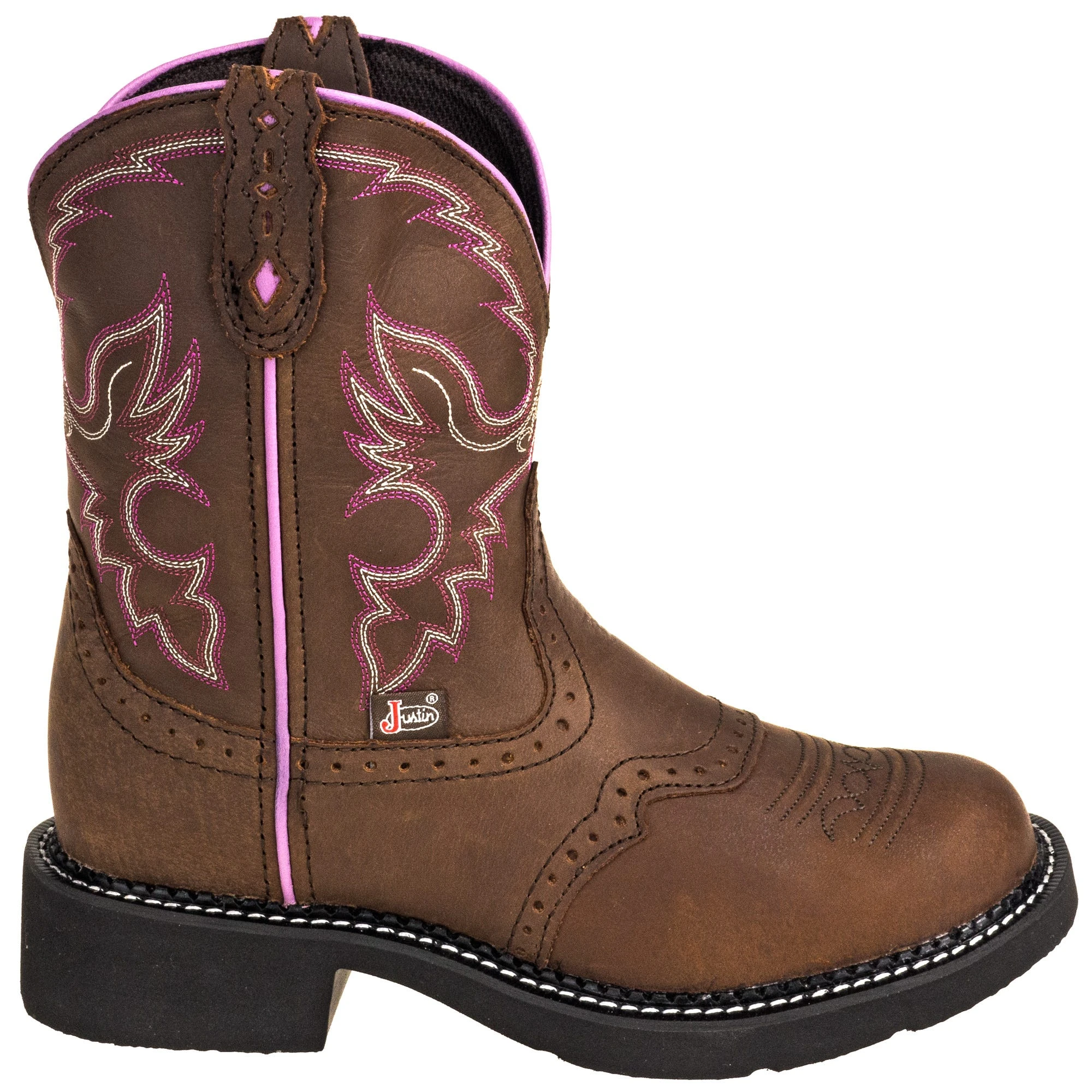 What ISN’T to love about a good pair of cowboy boots? With the easy on/easy off design, hardworking attitude, and a touch of style that makes them perfect for the barn or the barn dance, it’s no wonder why cowboy boots are so well loved as work boots and fashion footwear. And when you’re wearing Justin boots, you can add comfort and style to the list of reasons why you love your women’s boots. Take a look at these ~Justin Gemma Women’s GY9903 Brown 8-Inch General Toe Cowboy Boots – everything about them is tough and ready for anything, but the added dash of fun feminine style is everything with these dark brown and pink cowgirl boots. The 8-inch height is not as tall as traditional styles, and the shorter, flatter heels also feel more like a boot than the traditional cowboy heels. These features and more add up to the perfect pair of cowboy style general toe boots for ladies who love to have a little style in their day, even when there are chores to be done.